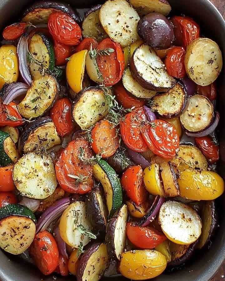 Once the vegetables are roasted to perfection, remove the dish from the oven and let it cool slightly.
