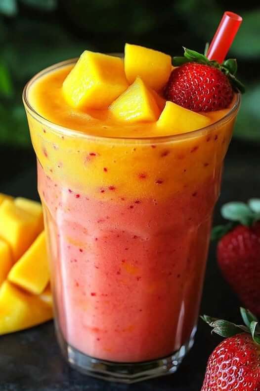- Pour into a glass, garnish with a few extra strawberries or mango slices, and enjoy!