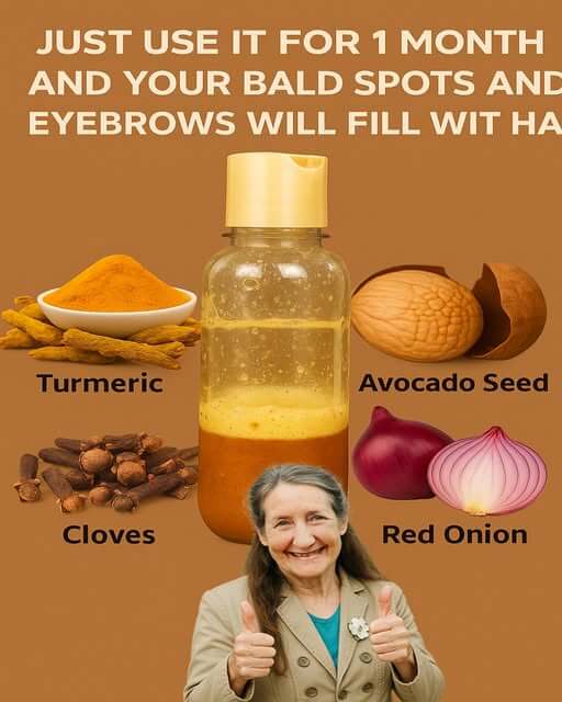 Natural remedy recipe using turmeric, avocado seeds, red onion, and cloves to help with bald spots and eyebrow regrowth, along with its benefits, step-by-step preparation, usage instructions, and precautions.