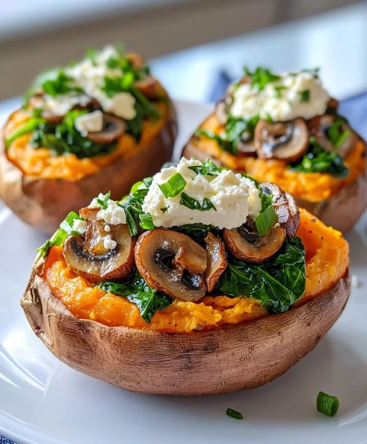 Twice-Baked Sweet Potatoes with Spinach, Mushrooms & Feta are a deliciously satisfying blend of earthy flavors, creamy texture, and Mediterranean flair. These sweet potatoes are baked until tender, then scooped out and mixed with sautéed spinach, garlic-infused mushrooms, tangy feta cheese, and herbs. The flavorful mixture is stuffed back into the skins and baked again until golden and warm.