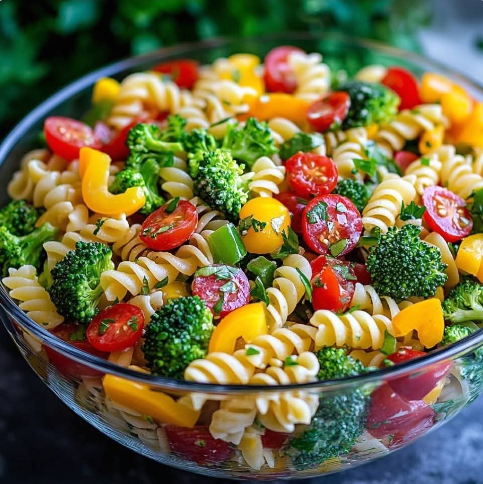 This beautiful dish is a Vibrant Veggie Pasta Salad—a colorful healthy and refreshing option perfect for picnics potlucks or light meals. It combines spiral rotini pasta with a mix of fresh vegetables like broccoli cherry tomatoes bell peppers and herbs. The salad is typically tossed in a simple vinaigrette or Italian dressing making it both satisfying and easy to prepare.
