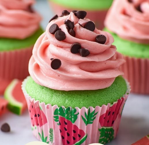 These Watermelon Cupcakes are a playful dessert with a green “rind,” pink “flesh,” and chocolate chip “seeds” — a hit at summer BBQs and kids’ parties. You can use a watermelon-flavored essence or keep it classic with vanilla and tint it to look like watermelon. Either way, they’re moist, fluffy, and irresistibly cute!