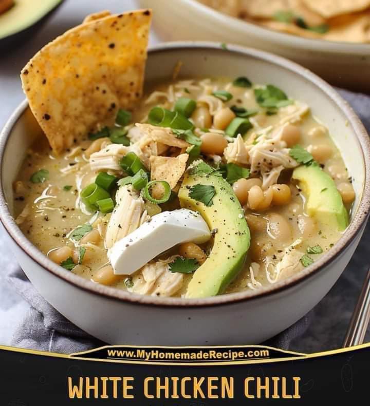 This White Chicken Chili recipe combines sautéed onions and garlic with broth, chiles, chicken, beans, and cream cheese, simmering until creamy. Serve topped with Monterey Jack cheese, scallions, cilantro, avocado, and tortilla chips! 🤤❤️