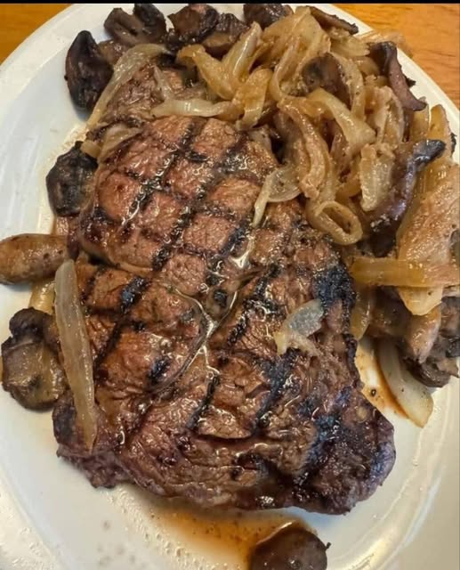 Top the steaks with the caramelized onions and sautéed mushrooms. Garnish with fresh thyme or parsley and serve hot. Enjoy your savory and indulgent steak dinner!