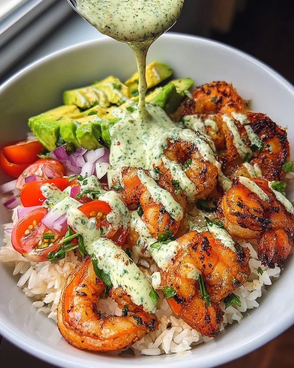 Zesty Shrimp & Avocado Rice Bowls with Cilantro Lime Sauce